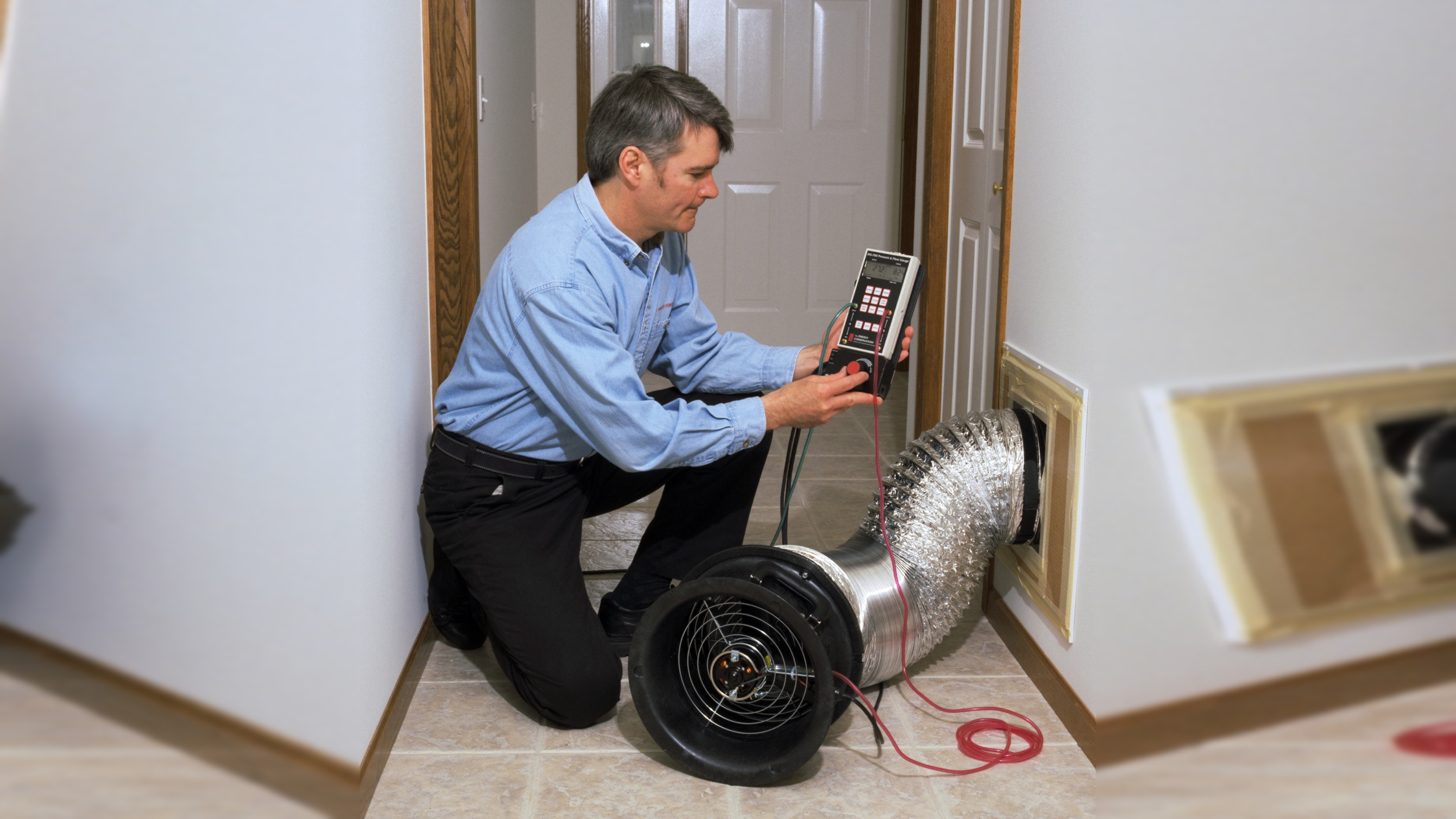 HVAC technician conducting a duct pressure test using a duct blaster fan mounted in an access panel — shows the diagnostic approach, not just cosmetic tape work
